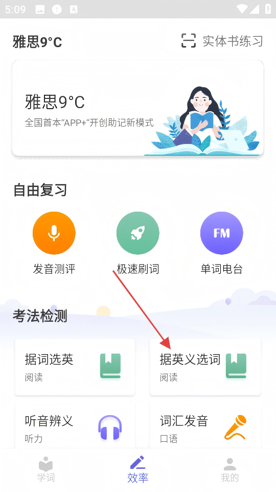 1、在效率页面,找到【考法检测】板块中的【据英义选词】功能并点击进入。