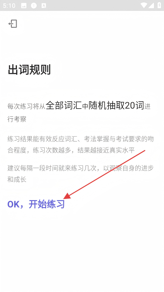 3、阅读【出词规则】内容后,点击【OK,开始练习】,进入题目作答环节。
