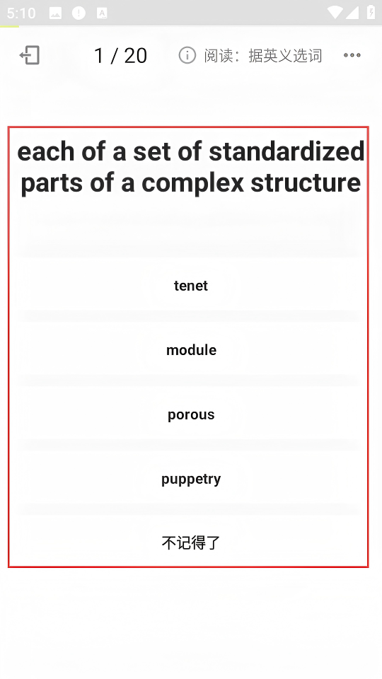 4、在题目界面,根据给出的英文释义,从选项中选择正确单词,完成【据英义选词】的练习。