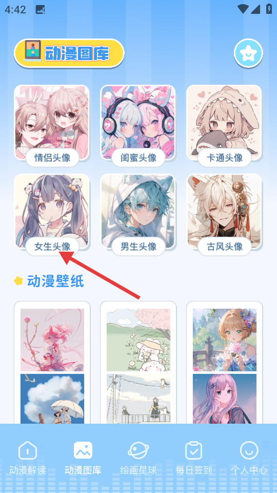 2、在动漫图库页面,选择【女生头像】分类,进入头像列表页。