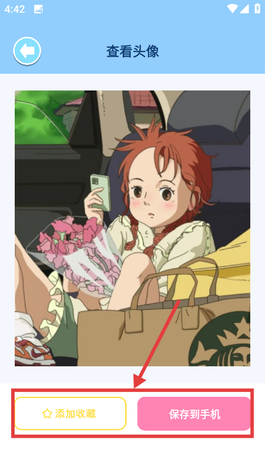 4、在查看头像详情页,可点击【添加收藏】或【保存到手机】,完成头像的收藏或保存操作。