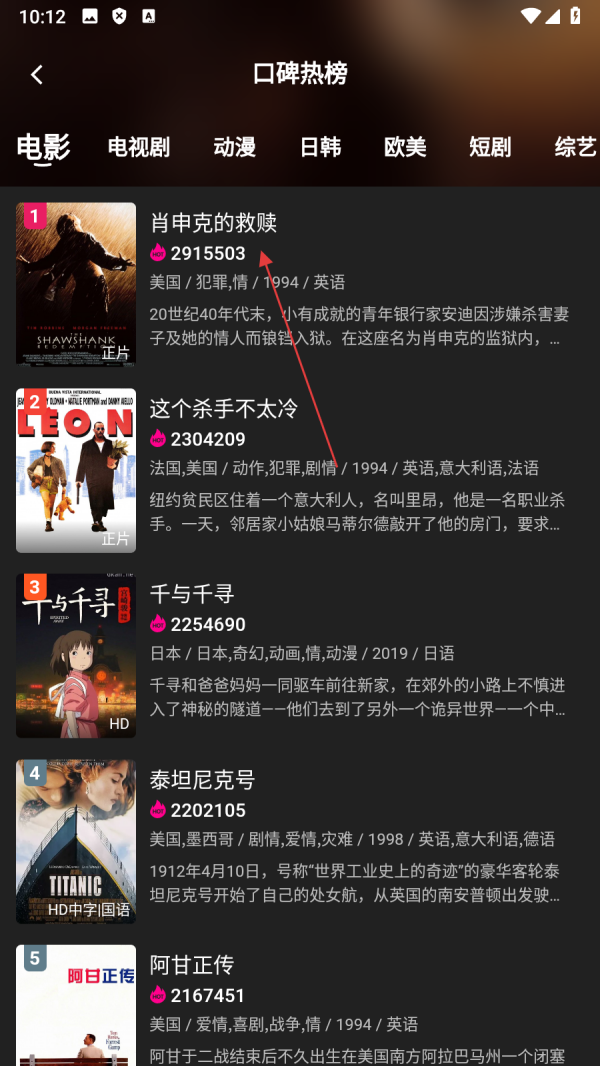 2、在口碑热榜页面,点击【肖申克的救赎】,进入影片播放页面。