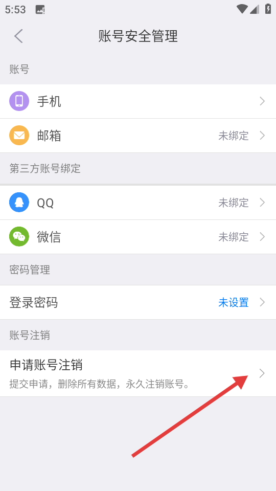 4、在账号安全管理界面,点击【申请账号注销】,进行账号注销操作。