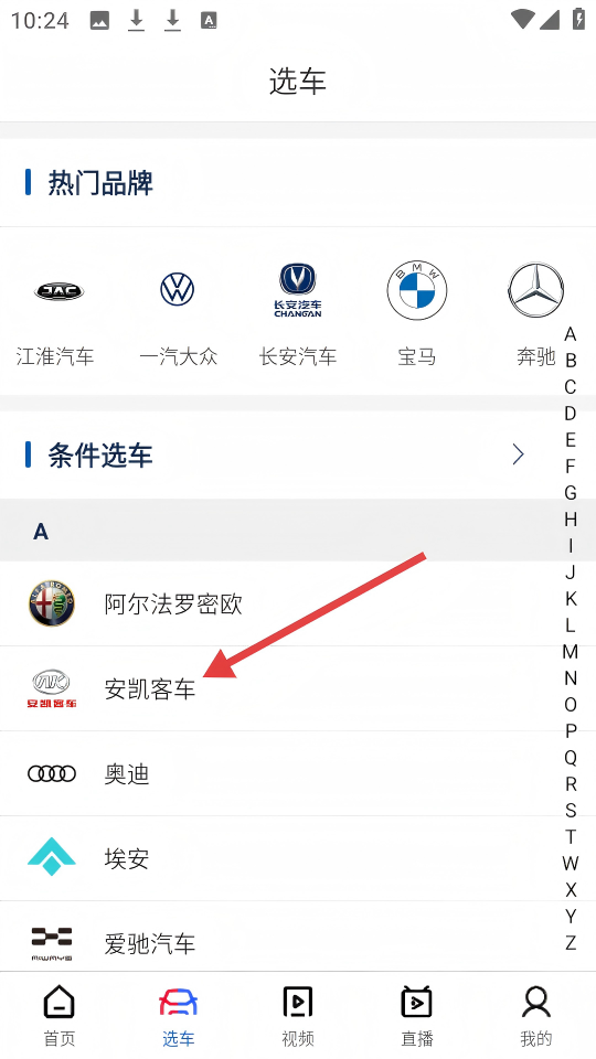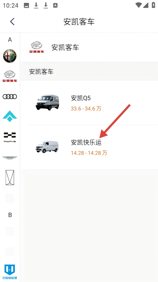 2、在选车页面的品牌列表A字母分类下,找到【安凯客车】并点击,可进入查看其车型。