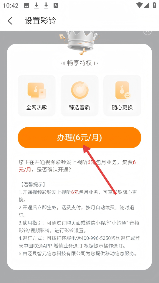 4、在设置彩铃页面,点击【办理(6元/月)】可开通视频彩铃爱上视听6元包月业务,享受相关特权。