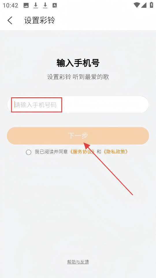 3、在设置彩铃页面,于【请输入手机号码】输入框输入手机号,勾选同意协议后点击【下一步】可继续设置彩铃。