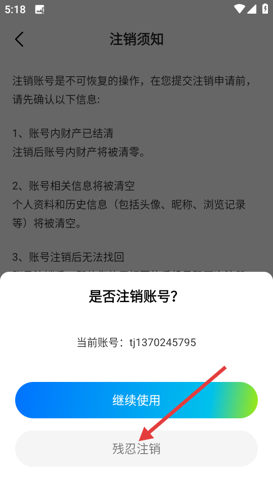 4、在注销确认弹窗中,点击【残忍注销】,完成账号注销操作。