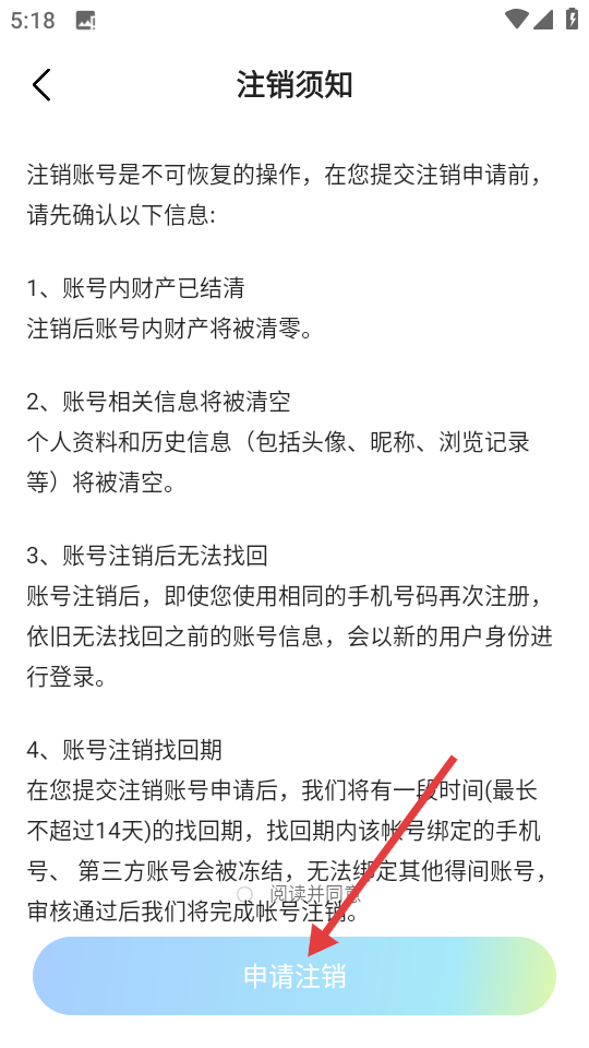3、在注销须知页面,点击【申请注销】,进入注销确认弹窗。
