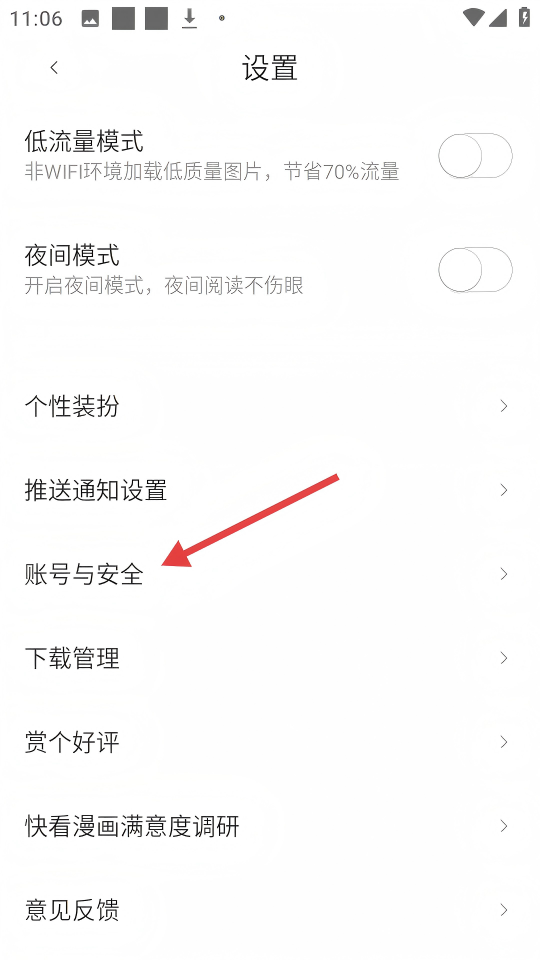 3、在设置页面,点击【账号与安全】选项进入其界面。