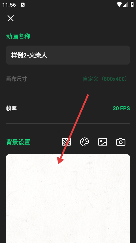4、在项目设置界面可查看并设置动画名称、画布尺寸、帧率、背景等参数。