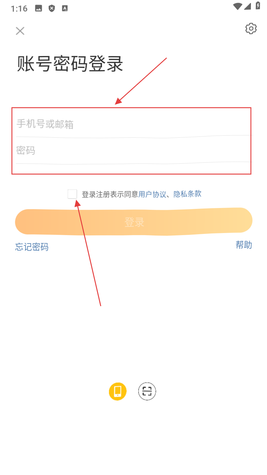 3、在账号密码登录页面,输入【手机号或邮箱、密码并勾选协议】,进入登录准备页面。
