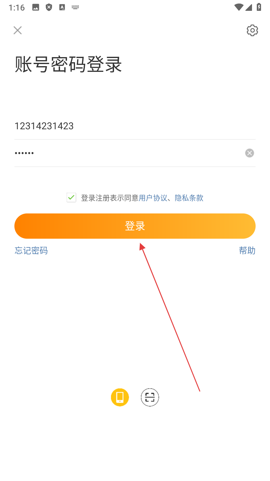 2、在登录方式选择页面,点击【账号密码登录图标】,进入账号密码登录页面。