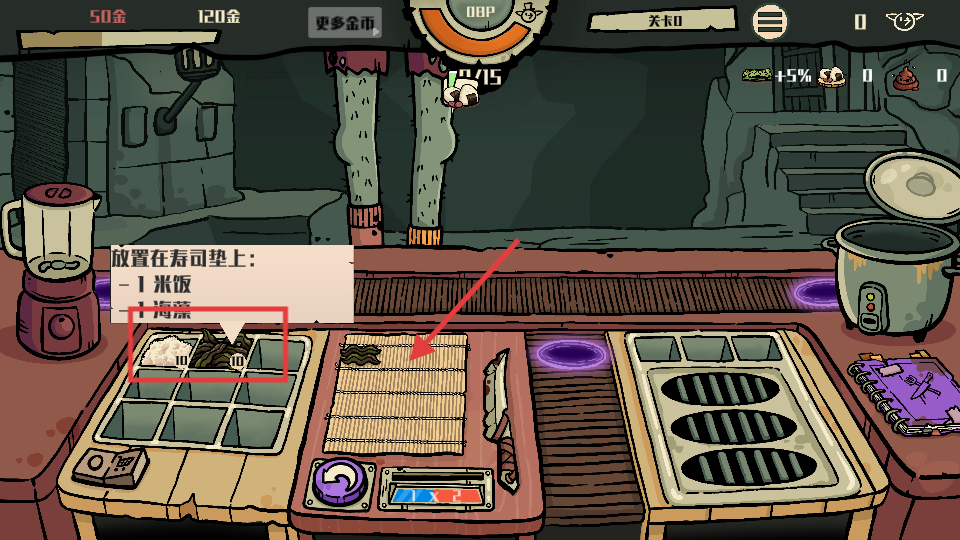 2、根据提示,把米饭、海藻等食材放到寿司垫上,准备制作寿司类食物。
