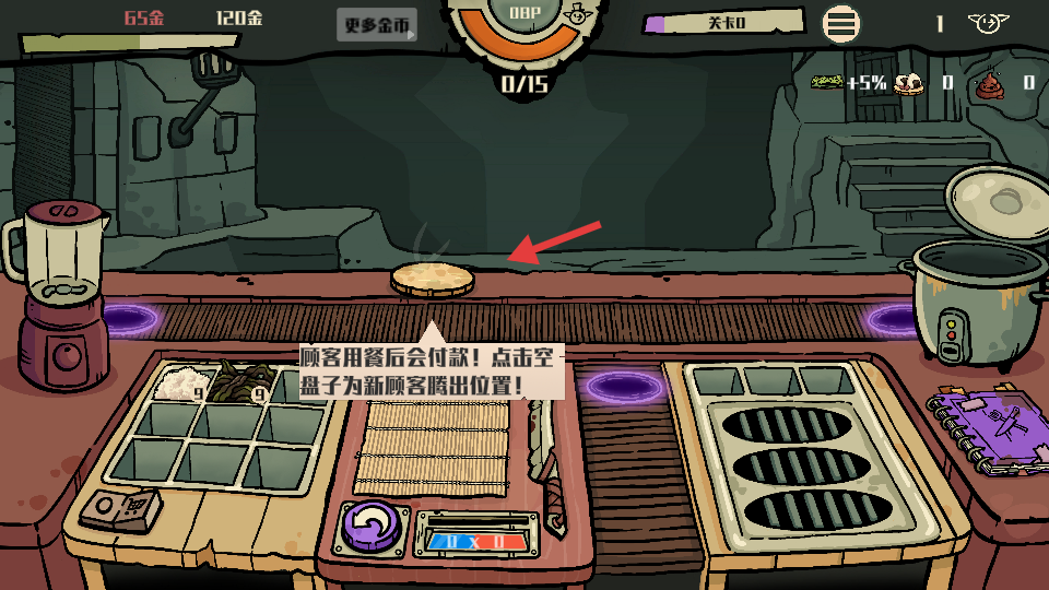 4、顾客用餐结束后,点击空盘子腾出位置,方便接待新顾客,持续经营赚取金币。
