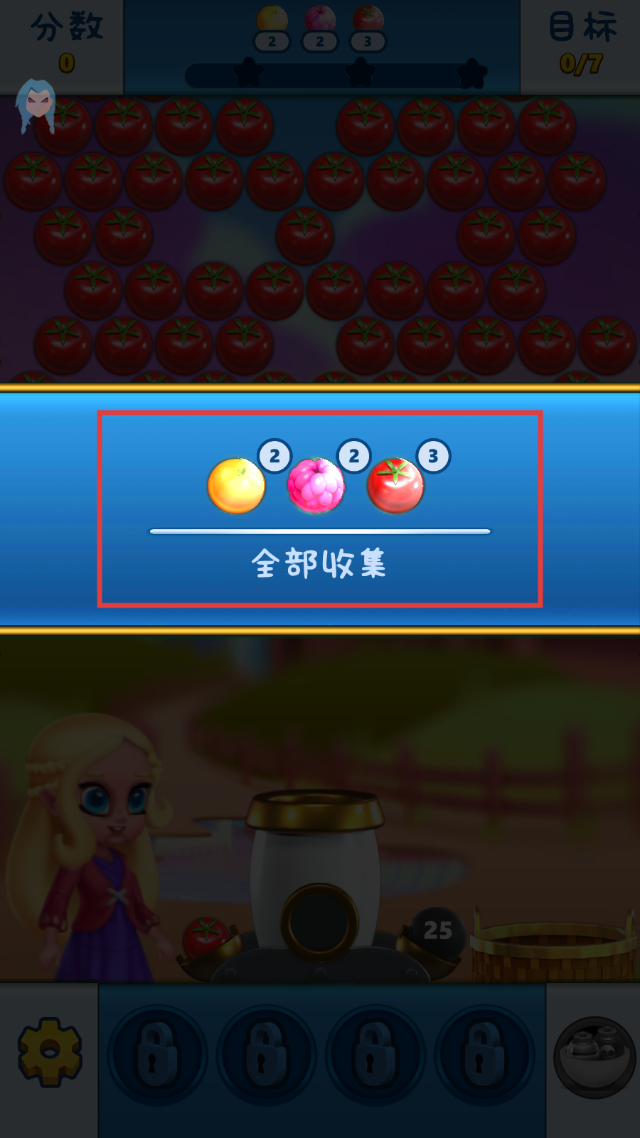 2、查看本关需要收集的水果及数量,明确游戏目标。