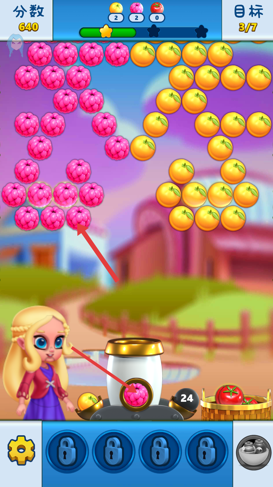 3、操控发射装置,发射对应水果,使其与上方同种类水果相连消除,收集目标水果。