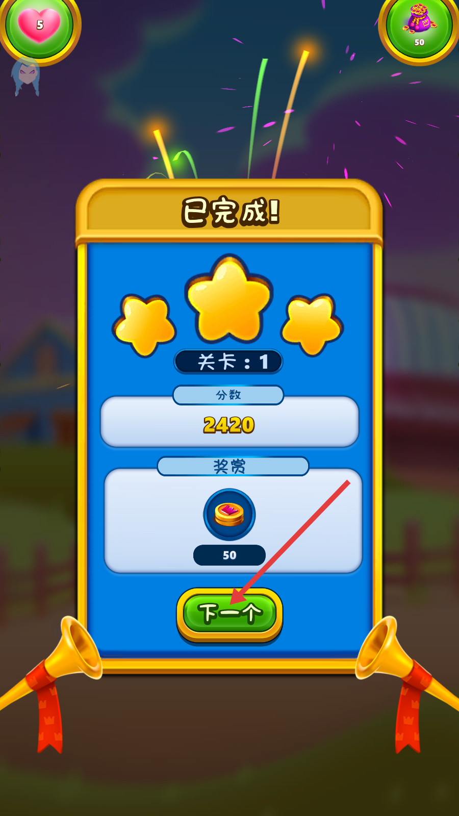 4、成功收集所有目标水果后,点击【下一个】按钮,进入下一关游戏。