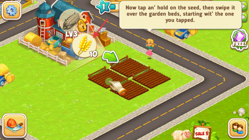 2、长按种子(如小麦种子),在菜园床(耕地)上滑动,从选中的耕地开始进行播种。