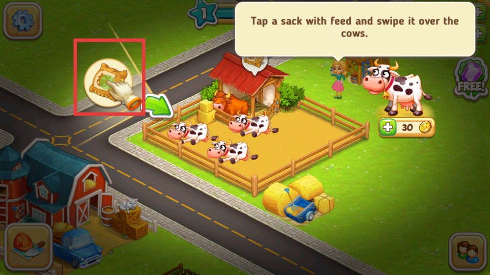 4、点击装有饲料的麻袋,在奶牛群上滑动,给奶牛投喂饲料,保障动物生长。