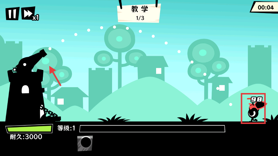 1、攻击左侧城堡上的目标点,当前等级1,耐久3000,留意右侧的敌人位置。