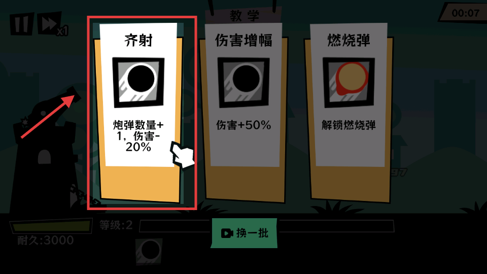 2、升级时选择齐射技能,增加炮弹数量1个,减少伤害20%,提升攻击频率。