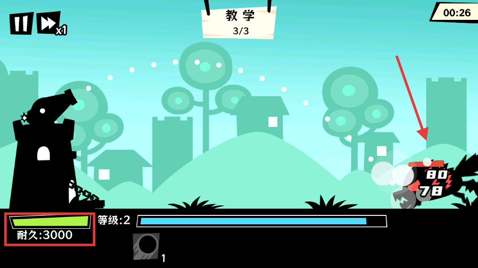3、应对右侧带有80和78数值的敌人,保持攻击,当前等级2,耐久3000。