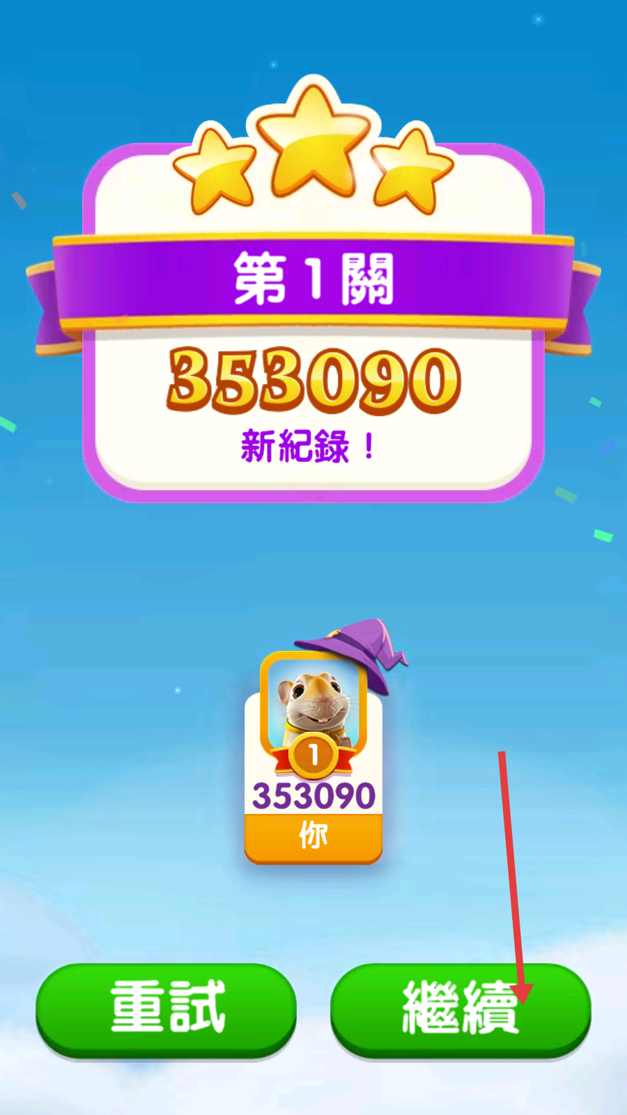 4、关卡完成后,点击【继续】按钮,进入下一关。