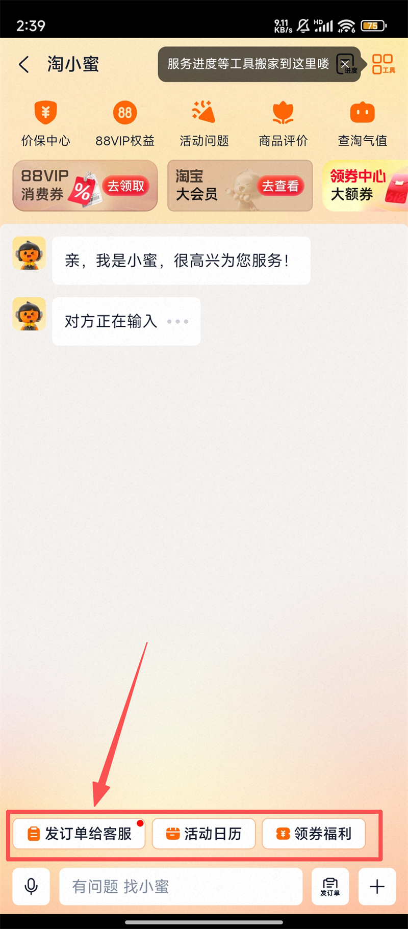 3、进入淘小蜜界面后,能看到【发订单给客服】、【活动日历】等功能按钮,按需选择就行。