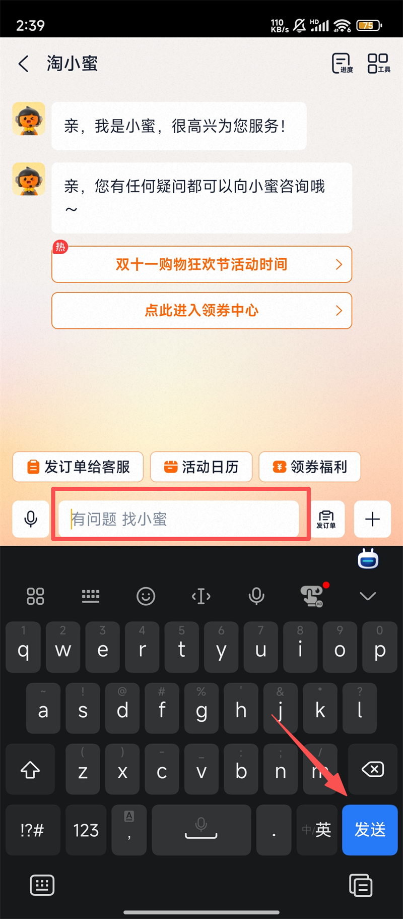 4、要是有问题,在输入框里输入想咨询的内容,然后点击【发送】,就能和客服交流联系啦。
