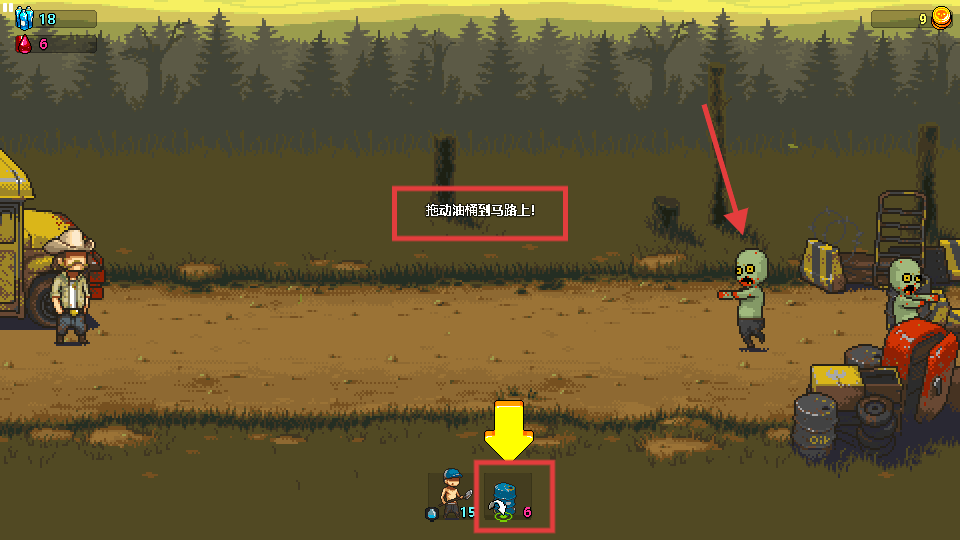 2、按提示拖动油桶道具到马路上,布置陷阱攻击僵尸,关注道具数量,合理使用。