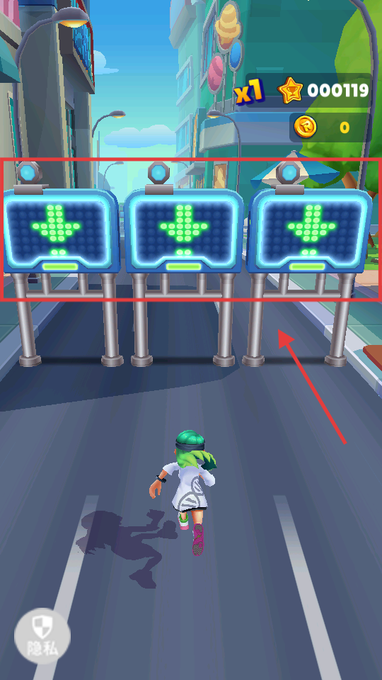 2、遇到前方三个带十字的蓝色装置时,要保持角色在中间通道穿过避免碰撞。
