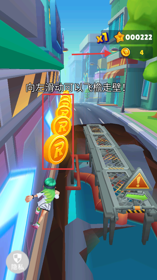 3、看到左侧墙上的金币时向左滑动屏幕,角色会飞檐走壁收集金币并避开下方障碍。
