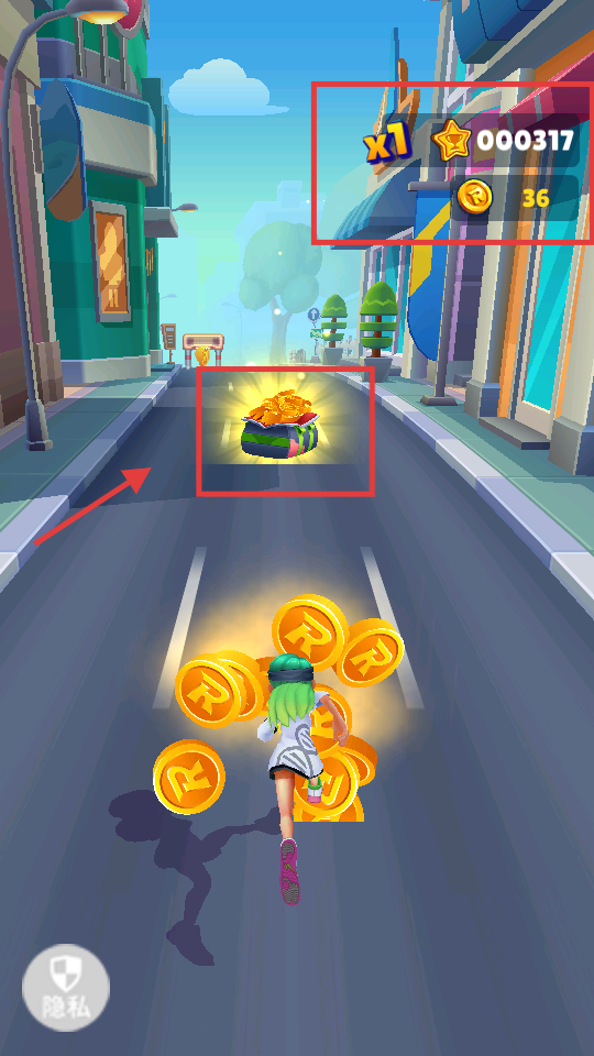 4、遇到道路中央的发光金币袋要尽量收集,它能快速增加金币数量和星星分数。