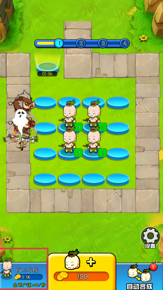 1、初始阶段可用100金币招募小孩角色,布置在蓝色格子上抵御左侧出现的怪物,积累金币产出。