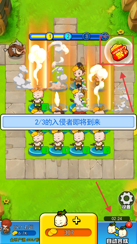 4、注意右上角的红包奖励,击败入侵者时记得领取,同时关注底部倒计时准备应对下一波攻击。