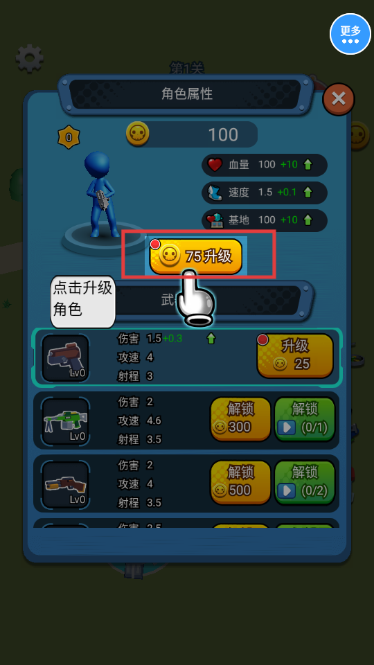 3、使用笑脸货币点击升级按钮提升角色等级,增强角色血量速度等属性。