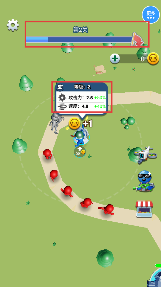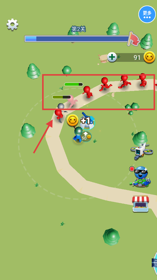 2、攻击路径上的红色敌人,击败后能获得金币和笑脸加一的奖励,积累资源用于后续防御。