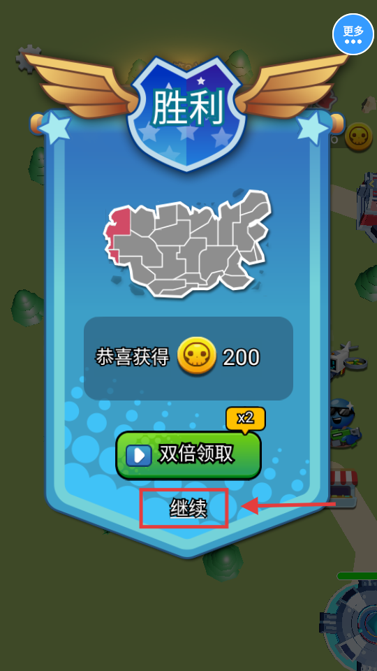4、关卡胜利后可领取200金币奖励,点击继续按钮进入下一关,继续挑战。