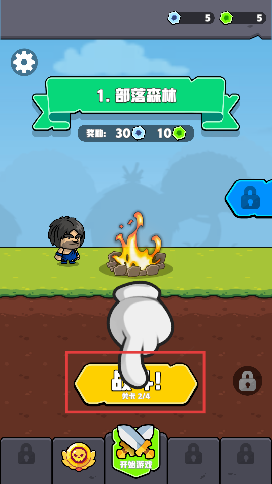 1、点击“战斗!关卡2/4”按钮,进入部落森林关卡,挑战可获30蓝钻、10绿钻奖励。