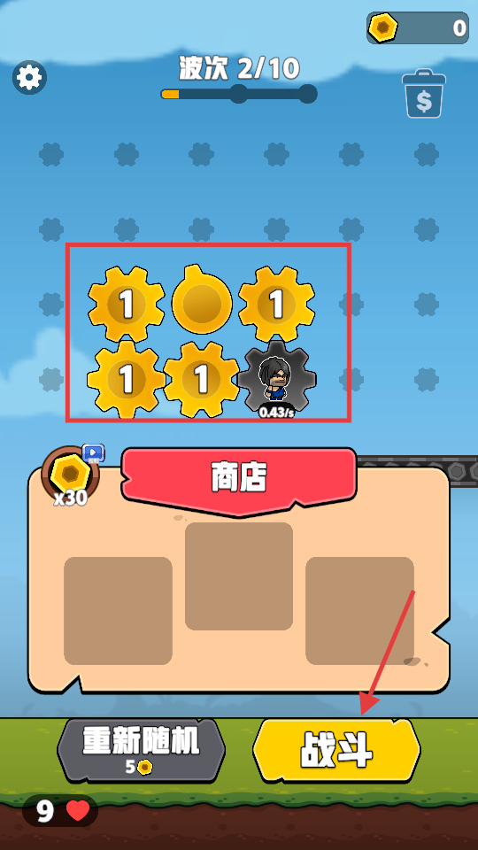 2、波次2/10时,观察黄色齿轮组合,点击“战斗”,让齿轮士兵出战,推进波次。
