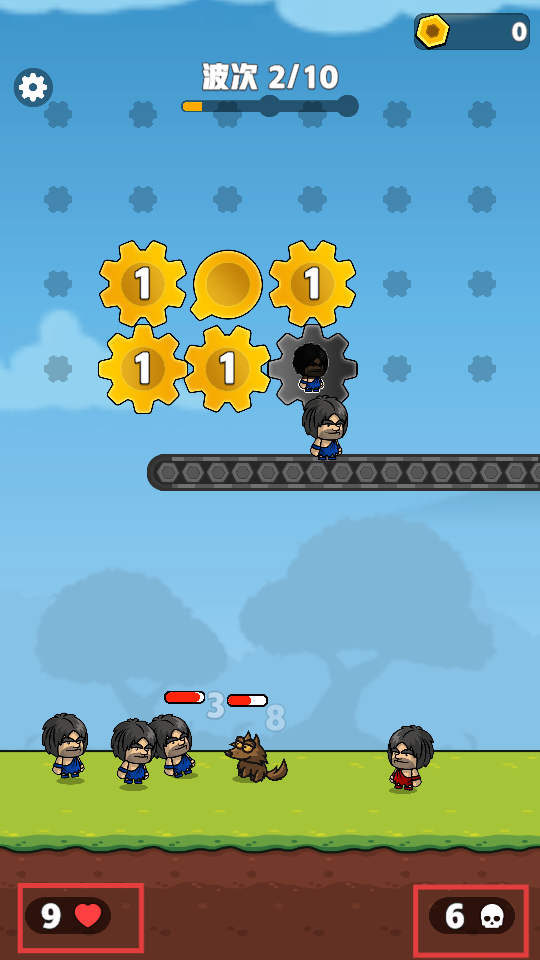 3、战斗中关注生命值(9心)与击杀数(6骷髅),部署士兵击败狼和敌人,积累战绩保血量。