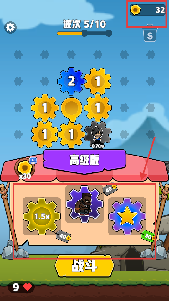 4、波次5/10时,用32金币在商店买1.5x、新士兵等增益,提升战力应对后续波次。