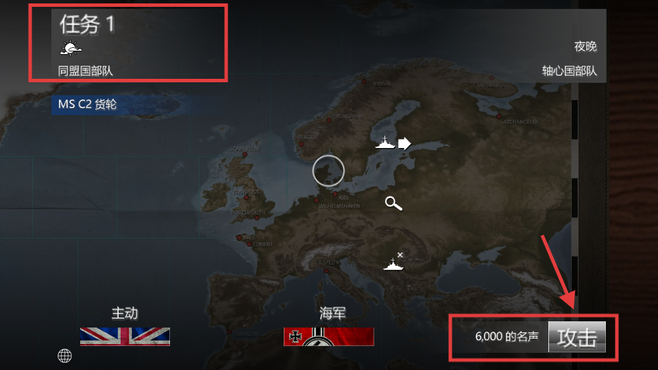 1、任务1界面点击“攻击”,获6000名声,确认同盟国阵营后即可开启海战任务。