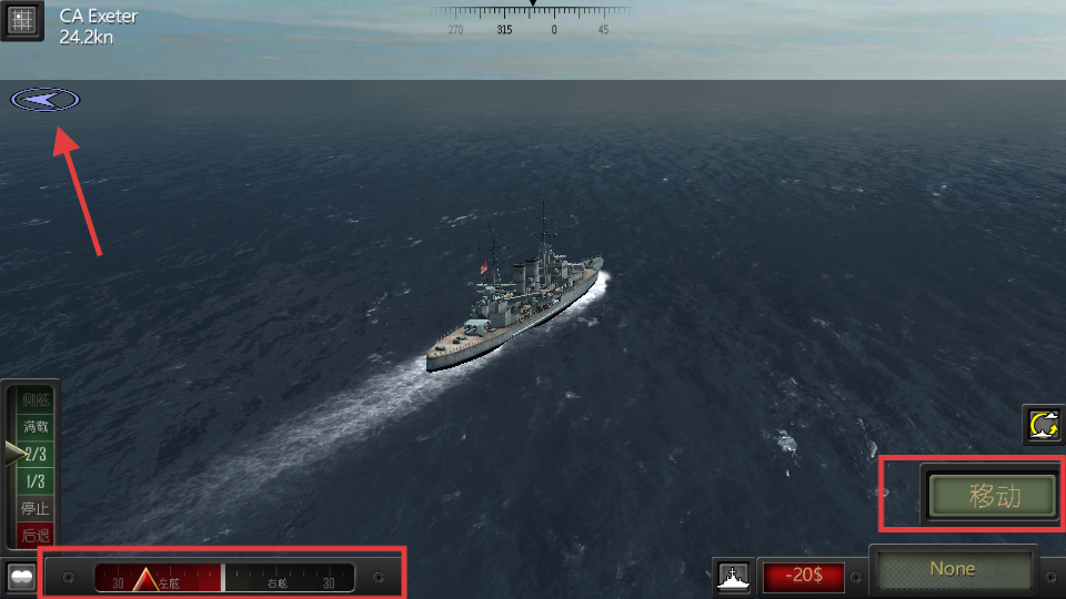 2、航行时点击“移动”,通过左/右舵条调整航向,观察左上角目标距离,规划接敌路线。