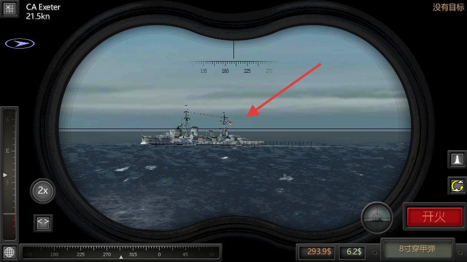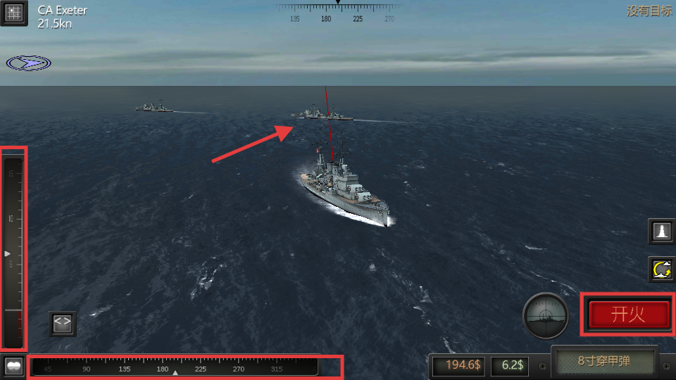 3、瞄准视角下锁定敌方舰船,选8寸穿甲弹等弹药,时机成熟点击“开火”实施打击。