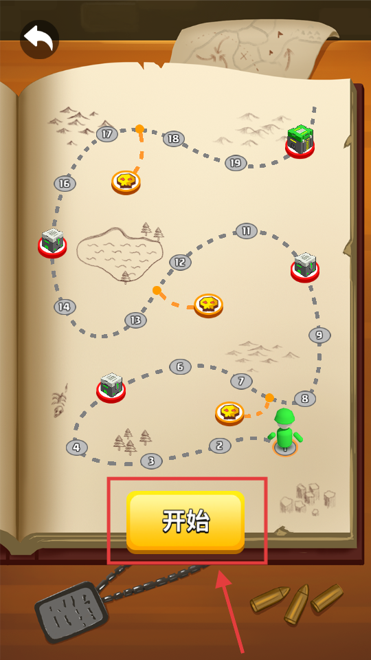 1、点击“开始”进入当前关卡,沿地图路线推进,挑战骷髅标识关卡,积累资源解锁新区域。