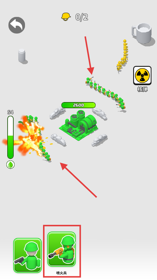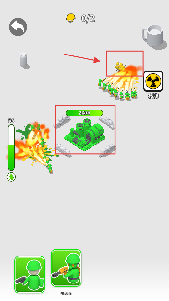 2、战斗时召唤喷火兵,配合绿色小兵进攻,注意保护2600血量的建筑,抵御敌方进攻。