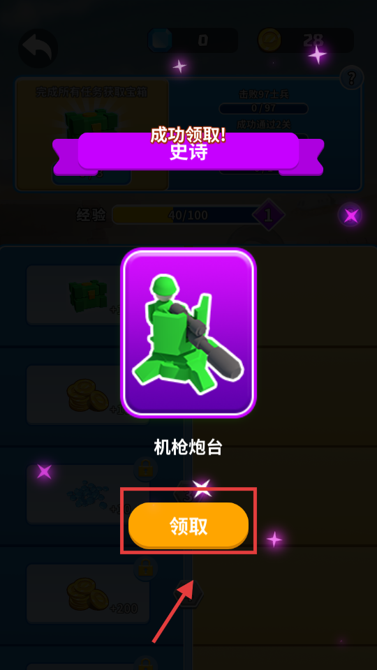 4、关卡胜利后点击“领取”,获取史诗级机枪炮台,解锁新防御单位,增强后续关卡战力。