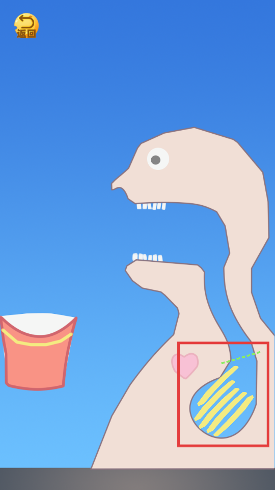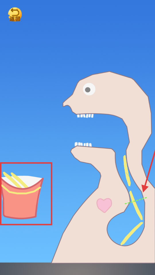 2、观察红框薯条位置,控制其移至怪物进食通道,确保顺利进入,满足进食需求。
