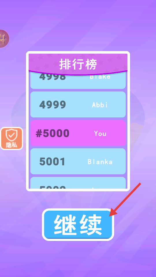 4、完成关卡,查看排行榜后点击【继续】,开启下一关卡。